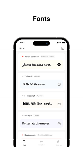 ด้วย Fonts คุณจะได้รับการเข้าถึงฟีเจอร์จำนวนมากเพื่อเสริมสร้างการออกแบบข้อความของคุณ มันมีคุณสมบัติการออกแบบหลากหลายภาษา ให้ฟอนต์ภาษากว่า 100 ภาษาเพื่อเข้าไปสร้างสรรค์บรรยากาศหลากหลายในสร้างสรรค์ของคุณ นอกจากนี้ การติดตั้งแบบคลิกเดียวช่วยให้การจัดการฟอนต์เป็นเรื่องรวดเร็วและไม่มีรอยต่อทันที สร้างการสร้างสรรค์ของข้อความของคุณในแอปพลิเคชันต่าง ๆ เช่น Word, Excel, PPT, Keynotes และอื่น ๆ ได้อย่างรวดเร็ว
